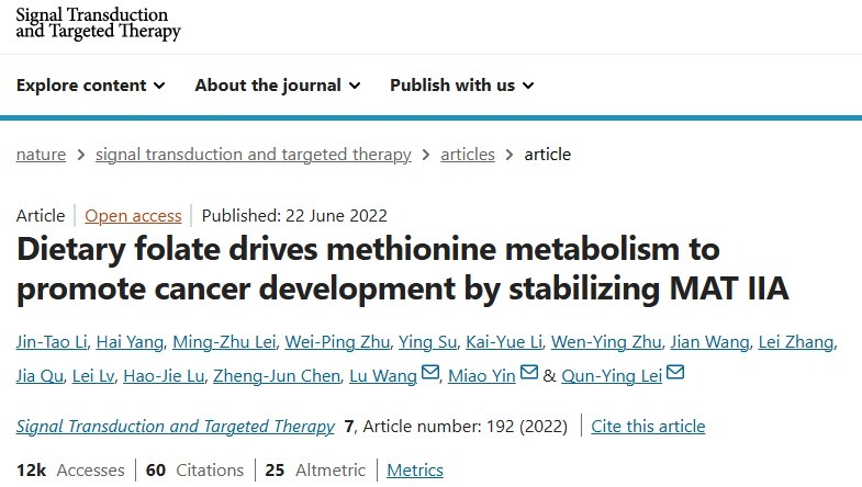 [3] Li, JT., Yang, H., Lei, MZ. et al. Dietary folate drives methionine metabolism to promote cancer development by stabilizing MAT IIA. Sig Transduct Target Ther 7, 192 (2022). https://doi.org/10.1038/s41392-022-01017-8
